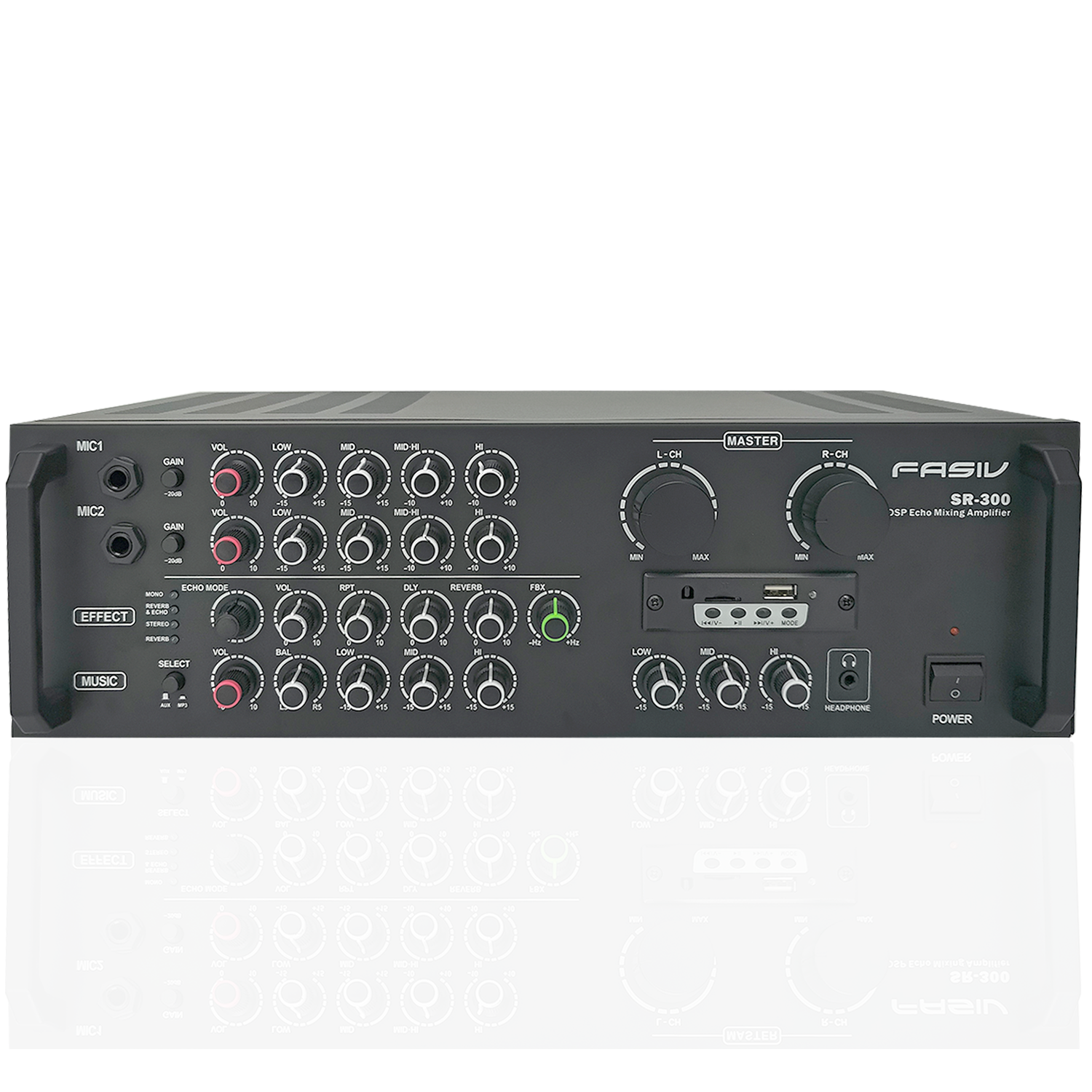 SR-300 karaoke amplifier with dual microphone configuration and gain function. E···...